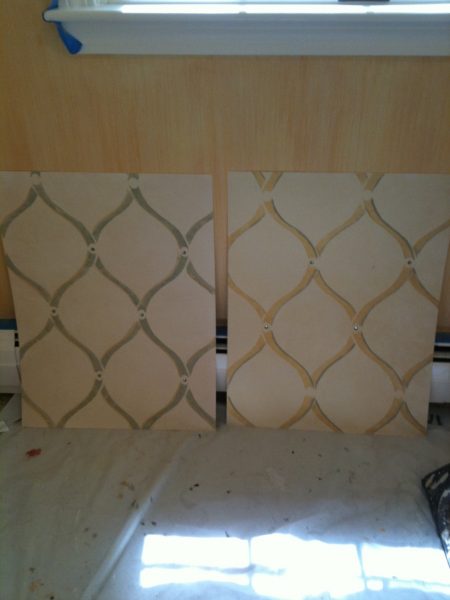 I already used this Hourglass stencil from Cutting Edge Designs in a back hallway downstairs in this same house. I don’t usually like to repeat a design or finish in the same house, but I am at a loss as to what to put on these remaining walls, and this pattern does fit the bill. Btw, back about an hundred sample boards ago, I did propose this exact concept, a soft metallic glaze background only I wanted a bamboo trellis allover pattern that would form a diamond pattern. It was rejected. 🙁